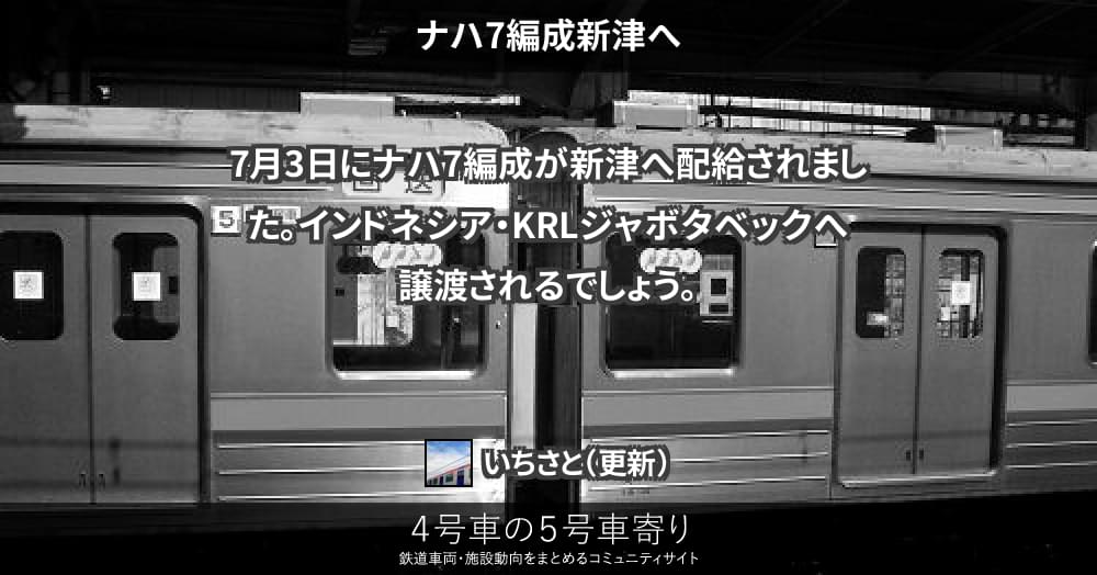 205系(東) ページ目次 ナハ7編成新津へ 更新コンテンツ サイト投稿写真 Twitterの写真 2015/07/032015/07/04 ナハ7編成新津へ 7月3日にナハ7編成が新津へ配給されました。インドネシア・KRLジャボタベックへ譲渡されるでしょう。 更新コンテンツ 404 Not Found 上記コンテンツ傘下のページも含みます。 サイト投稿写真 投稿画像がありません。205系(東)グループのアップローダーへ投稿頂いた写真は、こちらでご紹介致します。 href="https://twitter.com/iwashi_tairyou/status/616745672105037824">ナハ7編成新津へ