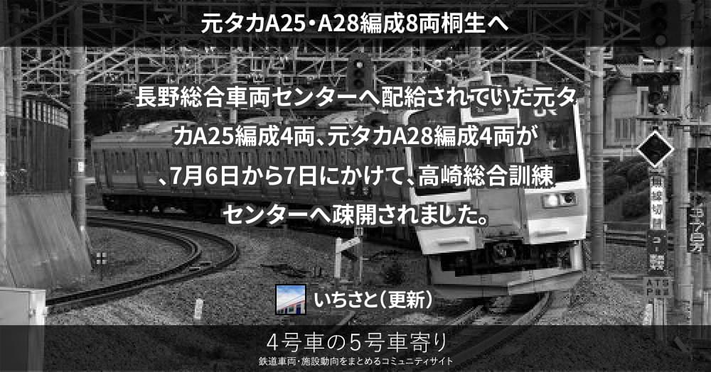 長野総合車両センターへ配給されていた元タカA25編成4両、元タカA28編成4両が、7月6日から7日にかけて、高崎総合訓練センターへ疎開されました。