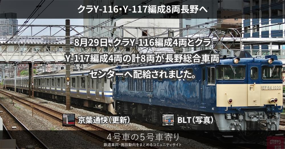 8月29日、クラY-116編成4両とクラY-117編成4両の計8両が長野総合車両センターへ配給されました。