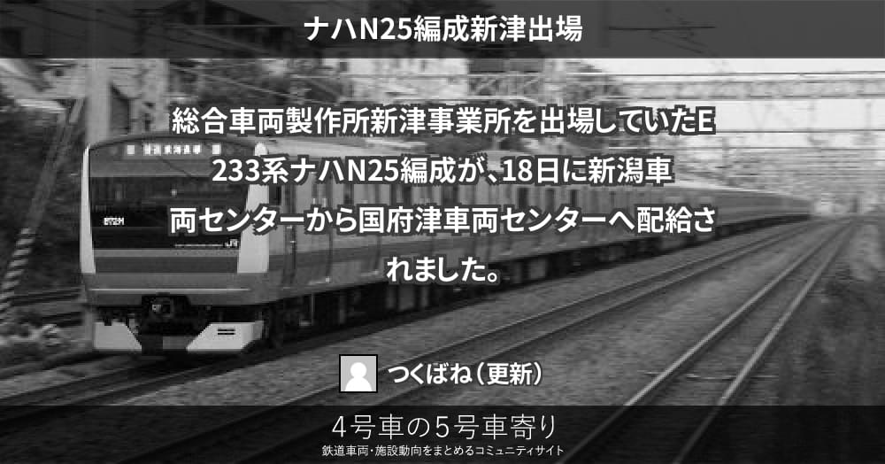 総合車両製作所新津事業所を出場していたE233系ナハN25編成が、18日に新潟車両センターから国府津車両センターへ配給されました。