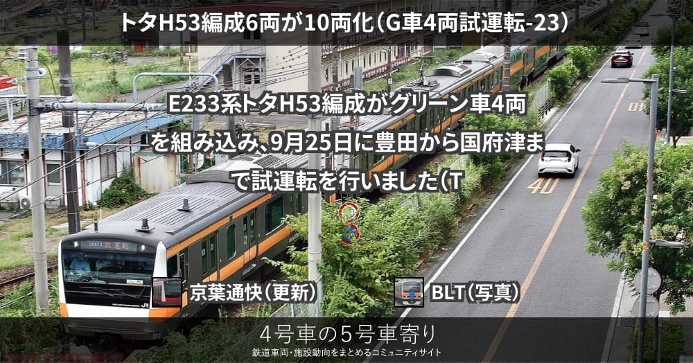 9/25、E233系グリーン車のうち、サロE233(E232)-49と50の計4両が、トタH53編成6両に組み込まれ10両で公式試運転が行われてます。