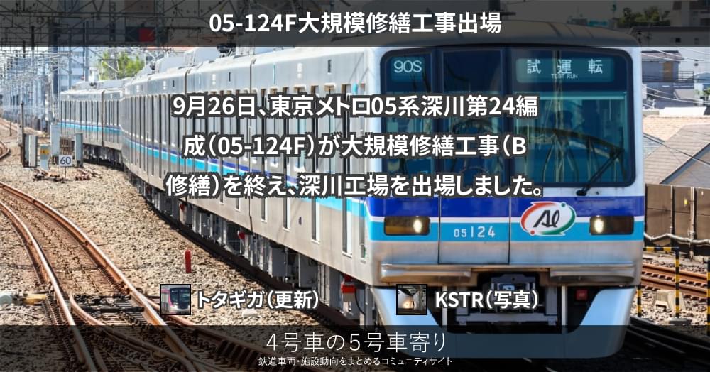 9月26日、東京メトロ05系深川第24編成(05-124F)が大規模修繕工事(B修繕)を終え、深川工場を出場しました。