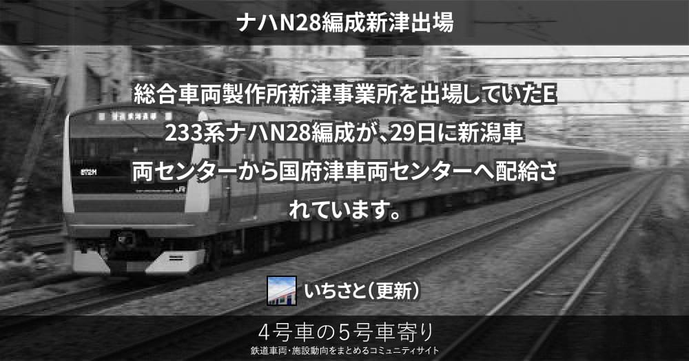 総合車両製作所新津事業所を出場していたE233系ナハN28編成が、29日に新潟車両センターから国府津車両センターへ配給されています。