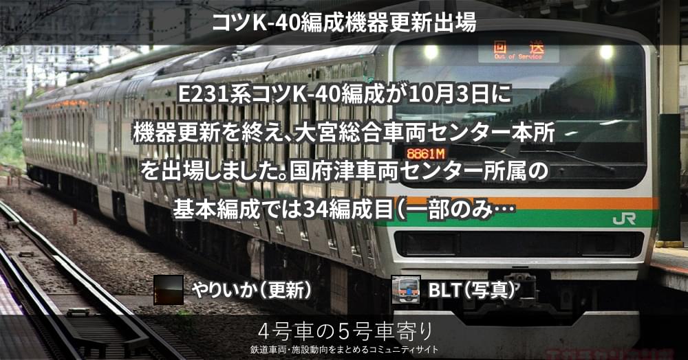 E231系コツK-40編成が10月3日に機器更新を終え、大宮総合車両センター本所を出場しました。