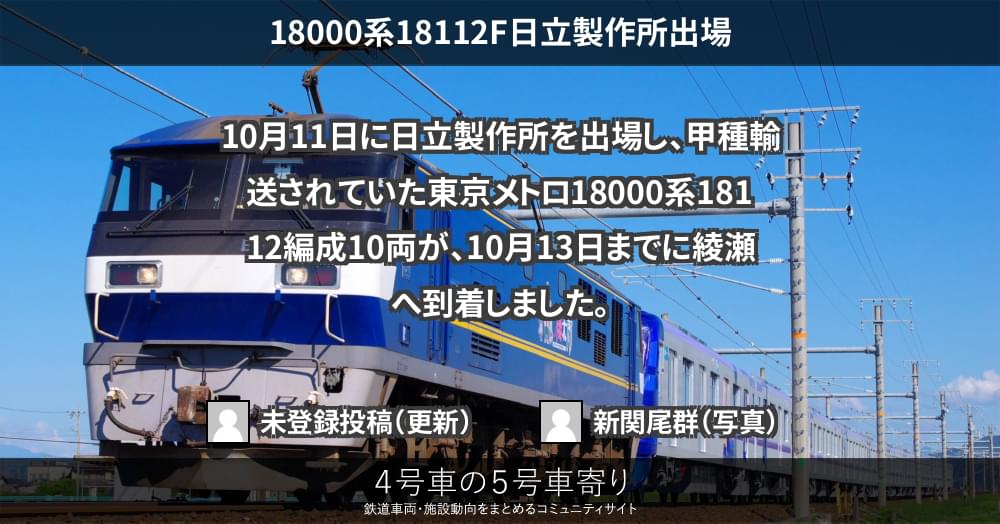 10月11日に日立製作所を出場し、甲種輸送されていた東京メトロ18000系18112編成10両が、10月13日までに綾瀬へ到着しました。