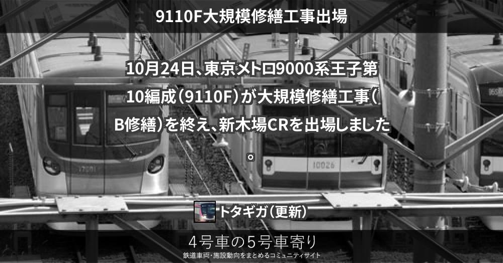 10月24日、東京メトロ9000系王子第10編成(9110F)が大規模修繕工事(B修繕)を終え、新木場CRを出場しました。