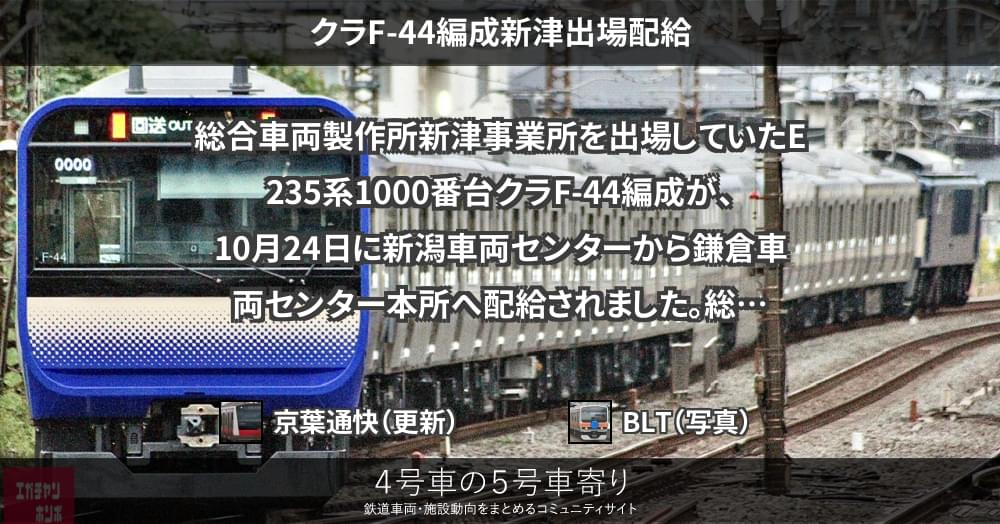 総合車両製作所新津事業所を出場していたE235系1000番台クラF-44編成が、10月24日に新潟車両センターから鎌倉車両センター本所へ配給されました。