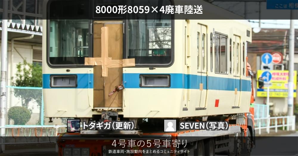 10月11日からし、その後、部品の撤去が確認されていた、小田急8000形8059x4(8059F)ですが、10月26日に新宿方2両(8059号車・8009号車)、10月31日に小田原方2両(8109号車・8159号車)がそれぞれ搬出され、解...