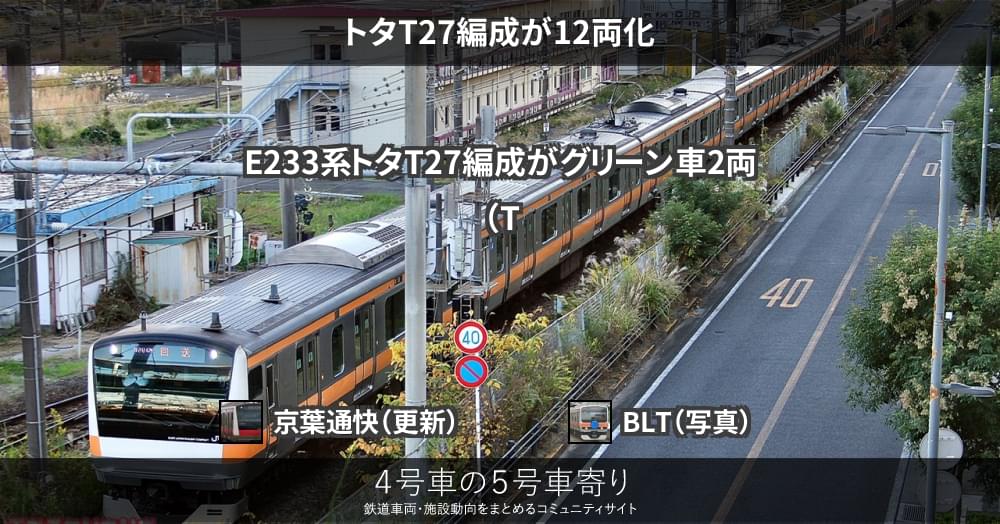 本日(12/2)、E233系トタT27編成が国府津車両センターから豊田車両センターへ、12両で自走回送されました。送り込みの目撃がありませんでしたが、新4・5号車にサロE232/E233-30を組み込んでいることから、国府津車両センターで1...