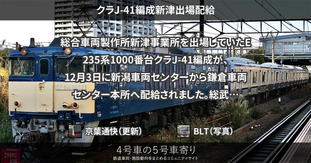 総合車両製作所新津事業所を出場していたE235系1000番台クラJ-41編成が、12月3日に新潟車両センターから鎌倉車両センター本所へ配給されました。