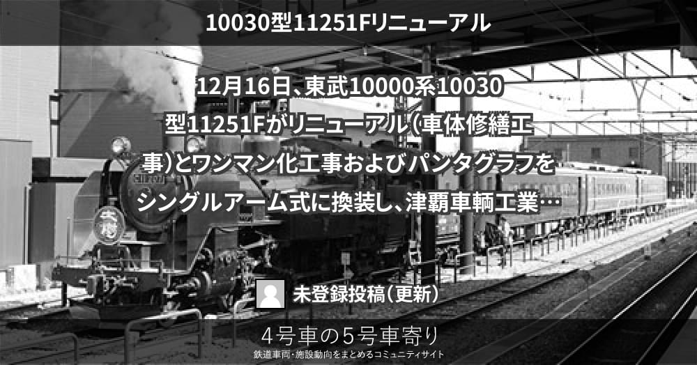 12月16日、東武10000系10030型11251Fがリニューアル(車体修繕工事)とワンマン化工事およびパンタグラフをシングルアーム式に換装し、津覇車輌工業を出場しました。