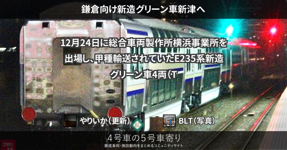 12月24日に総合車両製作所横浜事業所を出場し、甲種輸送されていたE235系新造グリーン車4両(TsdTsd’1048~1049)が、25日に新津へ到着しました。