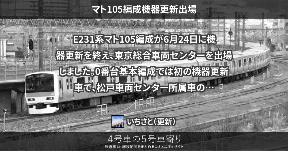 E231系マト105編成が6月24日に機器更新を終え、東京総合車両センターを出場しました。