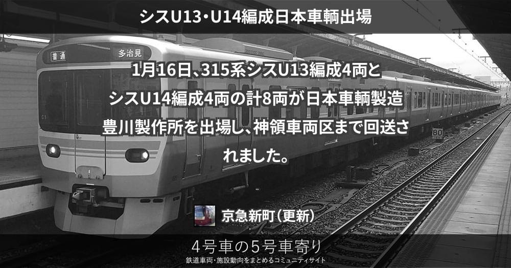 1月16日、315系シスU13編成4両とシスU14編成4両の計8両が日本車輌製造豊川製作所を出場し、神領車両区まで回送されました。