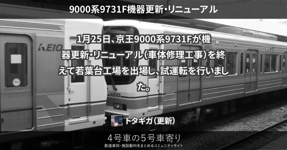 1月25日、京王9000系9731Fが機器更新・リニューアル(車体修理工事)を終えて若葉台工場を出場し、試運転を行いました。