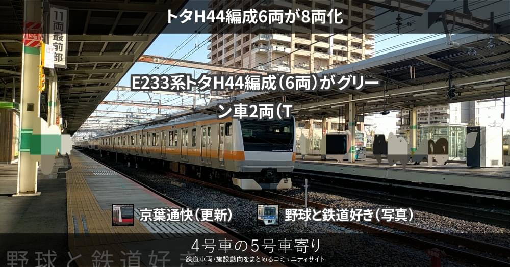 E233系トタH44編成(6両)がグリーン車2両(TsdTsd'39)を組み込み8両化され、1月31日に幕張車両センターから豊田車両センターまで回送されました。