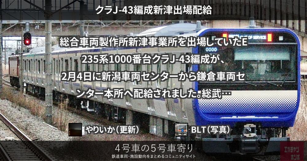 総合車両製作所新津事業所を出場していたE235系1000番台クラJ-43編成が、2月4日に新潟車両センターから鎌倉車両センター本所へ配給されました。