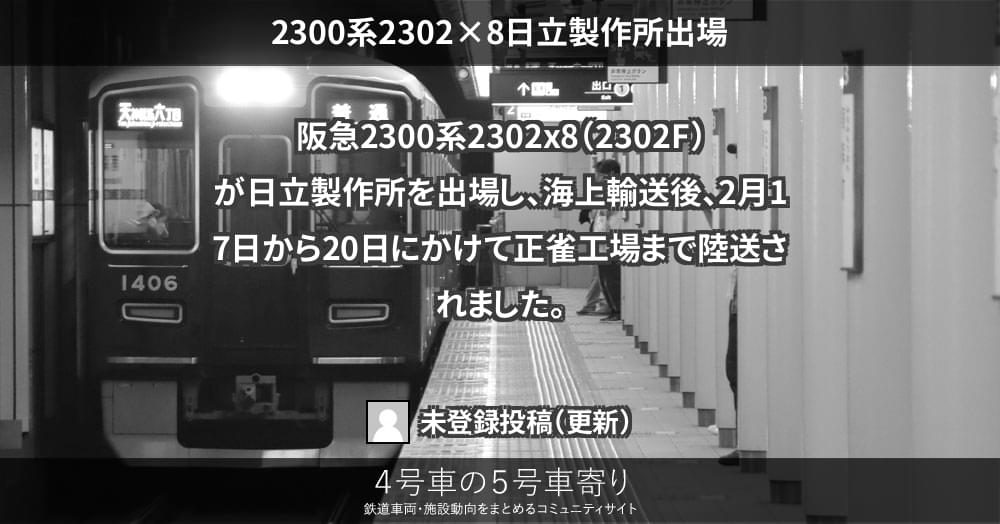 阪急2300系2302x8(2302F)が日立製作所を出場し、海上輸送後、2月17日から20日にかけて正雀工場まで陸送されました。