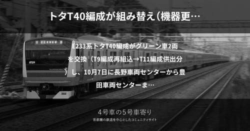 豊田車両センターで12両化が確認されていたトタT19編成が本日運用復帰されていることが確認されています。組み込まれているグリーン車はサロE233-22とサロE232-22の2両です。トタT19編成の運用復帰に伴いグリーン車組み込み予定のT...