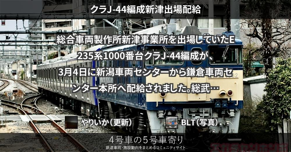 総合車両製作所新津事業所を出場していたE235系1000番台クラJ-44編成が、3月4日に新潟車両センターから鎌倉車両センター本所へ配給されました。