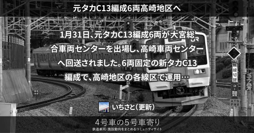 1月31日、元タカC13編成6両が大宮総合車両センターを出場し、高崎車両センターへ回送されました。