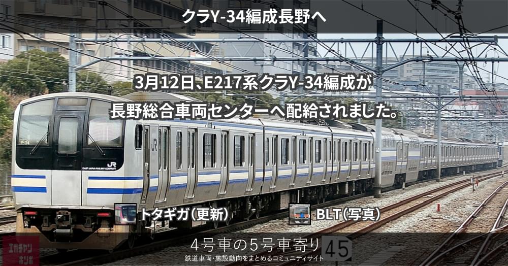 3月12日、E217系クラY-34編成が長野総合車両センターへ配給されました。
