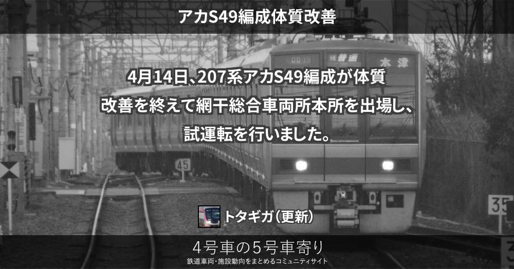 4月14日、207系アカS49編成が体質改善を終えて網干総合車両所本所を出場し、試運転を行いました。