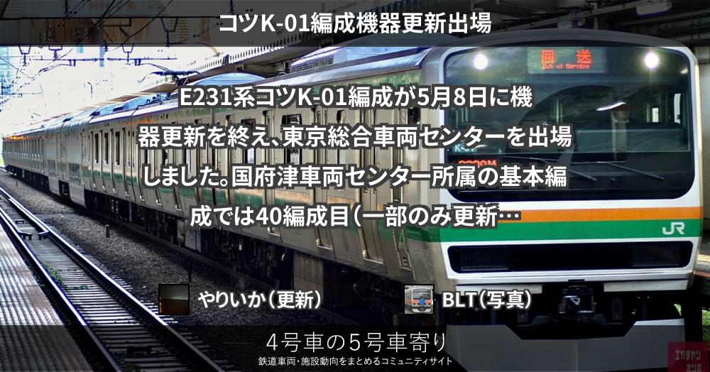 E231系コツK-01編成が5月8日に機器更新を終え、東京総合車両センターを出場しました。