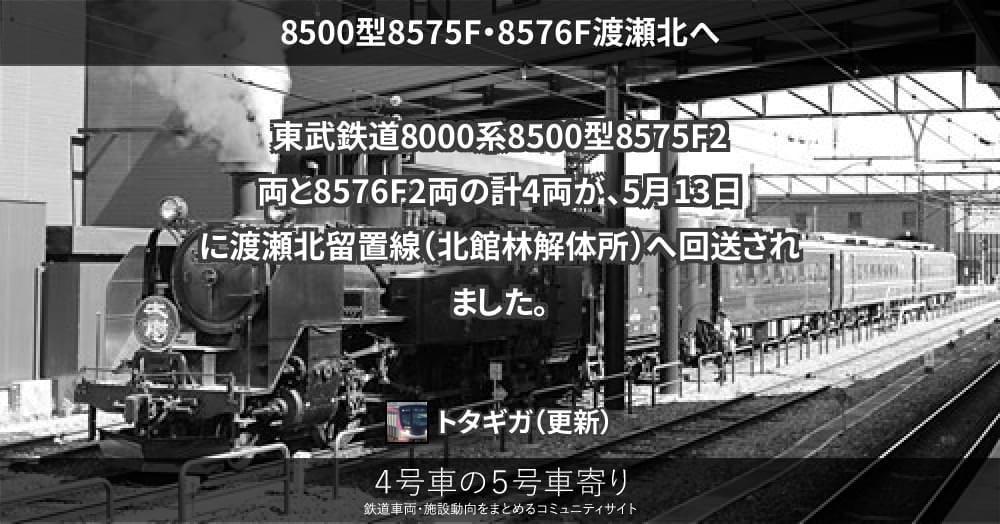 東武鉄道8000系8500型8575F2両と8576F2両の計4両が、5月13日に渡瀬北留置線(北館林解体所)へ回送されました。