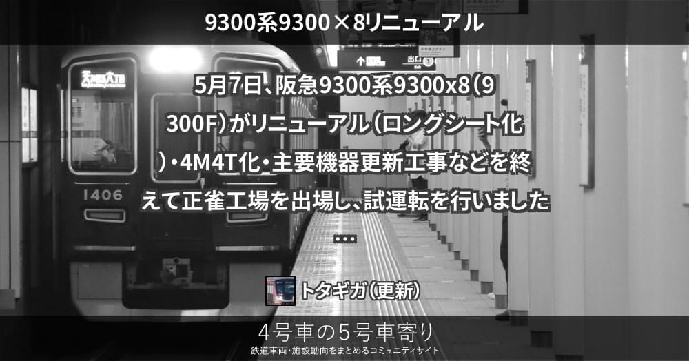 5月7日、阪急9300系9300x8(9300F)がリニューアル(ロングシート化)・4M4T化・主要機器更新工事などを終えて正雀工場を出場し、試運転を行いました。
