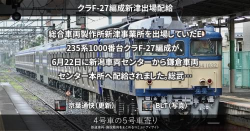 E235系 クラF-27編成新津出場配給 総合車両製作所新津事業所を出場していたE235系1000番台クラF-27編成が、6月22日に新潟車両センターから鎌倉車両センター本所へ配給されました。 総武快速・横須賀線向け1000番台の基本編成27本目です。 https://4gousya.net/forums/post/%e3%82%af%e3%83%a9f-27%e7%b7%a8%e6%88%90%e3%81%8c%e9%85%8d%e7%b5%a6%e8%bc%b8%e9%80%81 2023/06/22 2023/06/24 京葉通快 E235系