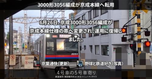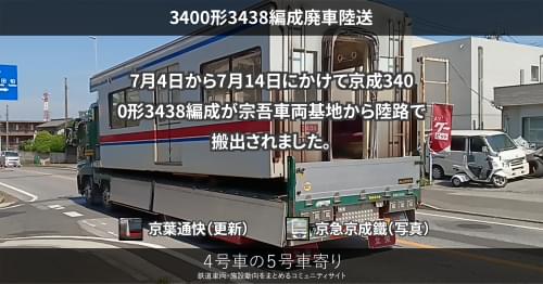 京成 3400形3438編成廃車陸送 7月4日から7月14日にかけて京成3400形3438編成が宗吾車両基地から陸路で搬出されました。 https://4gousya.net/forums/post/%e4%ba%ac%e6%88%903438%e7%b7%a8%e6%88%90%e3%81%8c%e6%90%ac%e5%87%ba%e5%ae%8c%e4%ba%86 2023/07/14 京葉通快 京成