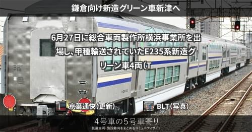 E235系 鎌倉向け新造グリーン車新津へ 6月27日に総合車両製作所横浜事業所を出場し、甲種輸送されていたE235系新造グリーン車4両(TsdTsd’1029~1030)が、28日に新津へ到着しました。 https://4gousya.net/forums/post/e235%e7%b3%bb1000%e7%95%aa%e5%8f%b0%e3%82%b0%e3%83%aa%e3%83%bc%e3%83%b3%e8%bb%8a4%e4%b8%a1%e6%a8%aa%e6%b5%9c%e5%87%ba%e5%a0%b4-4 2023/06/28 京葉通快 E235系