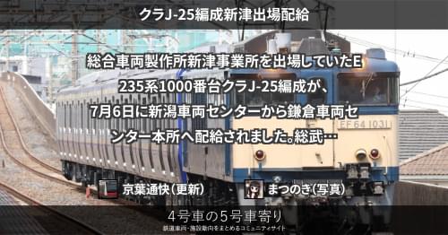 E235系 クラJ-25編成新津出場配給 総合車両製作所新津事業所を出場していたE235系1000番台クラJ-25編成が、7月6日に新潟車両センターから鎌倉車両センター本所へ配給されました。 総武快速・横須賀線向け1000番台の付属編成25本目です。 https://4gousya.net/forums/post/%e3%82%af%e3%83%a9j-25%e7%b7%a8%e6%88%90%e3%81%8c%e9%85%8d%e7%b5%a6%e8%bc%b8%e9%80%81 2023/07/06 京葉通快 E235系