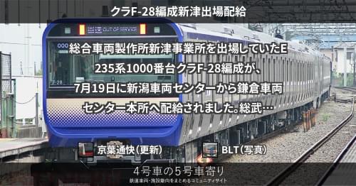 E235系 クラF-28編成新津出場配給 総合車両製作所新津事業所を出場していたE235系1000番台クラF-28編成が、7月19日に新潟車両センターから鎌倉車両センター本所へ配給されました。 総武快速・横須賀線向け1000番台の基本編成28本目です。 https://4gousya.net/forums/post/%e3%82%af%e3%83%a9f-28%e7%b7%a8%e6%88%90%e3%81%8c%e9%85%8d%e7%b5%a6%e8%bc%b8%e9%80%81 2023/07/19 2023/07/20 京葉通快 E235系