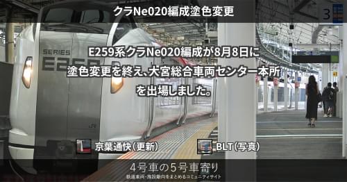 E259系 クラNe020編成塗色変更 E259系クラNe020編成が8月8日に塗色変更を終え、大宮総合車両センター本所を出場しました。 https://4gousya.net/forums/post/%e3%82%af%e3%83%a9ne020%e7%b7%a8%e6%88%90%e3%81%8c%e5%a4%a7%e5%ae%ae%e5%87%ba%e5%a0%b4%e5%a1%97%e8%a3%85%e5%a4%89%e6%9b%b4 2023/08/08 京葉通快 E259系