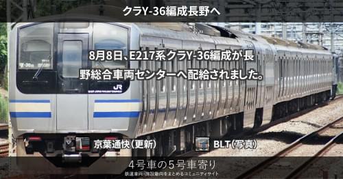 E217系 クラY-36編成長野へ 8月8日、E217系クラY-36編成が長野総合車両センターへ配給されました。 https://4gousya.net/forums/post/%e3%82%af%e3%83%a9y-36%e7%b7%a8%e6%88%90%e9%85%8d%e7%b5%a6%e8%bc%b8%e9%80%81 2023/08/08 京葉通快 E217系