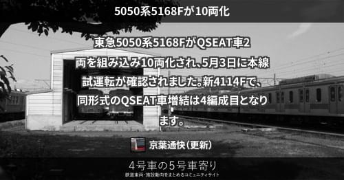 東急5050系5168FがQSEAT車2両を組み込み10両化され、5月3日に本線試運転が確認されました。