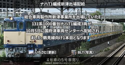 E131系 ナハT1編成新津出場配給 総合車両製作所新津事業所を出場していたE131系1000番台ナハT1編成3両が、10月5日に国府津車両センターへ配給されました。 鶴見線向け1本目となります。 https://4gousya.net/forums/post/%e3%83%8a%e3%83%8ft1%e7%b7%a8%e6%88%90%e3%81%8c%e9%85%8d%e7%b5%a6%e8%bc%b8%e9%80%81 2023/10/05 いちさと E131系