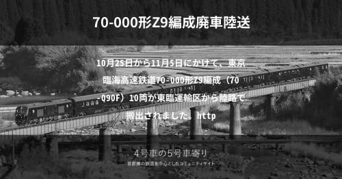 10月25日から11月5日にかけて、東京臨海高速鉄道70-000形Z9編成(70-090F)10両が東臨運輸区から陸路で搬出されました。