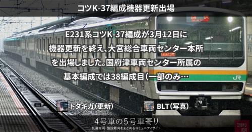 E231系コツK-37編成が3月12日に機器更新を終え、大宮総合車両センター本所を出場しました。