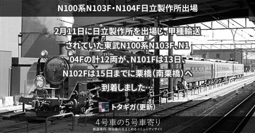 2月11日に日立製作所を出場し、甲種輸送されていた東武N100系N103F、N104Fの計12両が、N101Fは13日、N102Fは15日までに栗橋(南栗橋)へ到着しました。