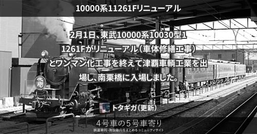 2月1日、東武10000系10030型11261Fがリニューアル(車体修繕工事)とワンマン化工事を終えて津覇車輌工業を出場し、南栗橋に入場しました。