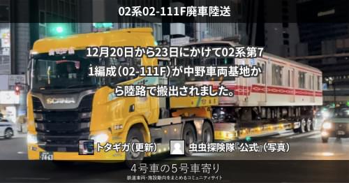 メトロ 02系02-111F廃車陸送 12月20日から23日にかけて02系第71編成(02-111F)が中野車両基地から陸路で搬出されました。 https://4gousya.net/forums/post/%e6%9d%b1%e4%ba%ac%e3%83%a1%e3%83%88%e3%83%ad02-111f%e3%81%8c%e4%b8%ad%e9%87%8e%e3%81%8b%e3%82%89%e6%90%ac%e5%87%ba 廃車として扱います。 2023/12/23 2023/12/25 トタギガ メトロ