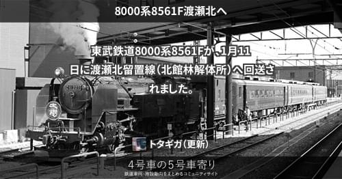東武 8000系8561F渡瀬北へ 東武鉄道8000系8561Fが、1月11日に渡瀬北留置線(北館林解体所)へ回送されました。 https://4gousya.net/forums/post/%e6%9d%b1%e6%ad%a68561f%e3%81%8c%e5%8c%97%e9%a4%a8%e6%9e%97%e3%81%b8%e8%87%a8%e6%99%82%e5%9b%9e%e9%80%81 2024/01/11 2024/01/12 トタギガ 東武