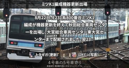 E231系 ミツK1編成機器更新出場 8月22日、E231系800番台ミツK1編成が機器更新を終えて秋田総合車両センターを出場し、大宮総合車両センター東大宮センターまで配給されました。翌23日中に三鷹車両センターまで回送されています。 同番台の機器更新は2本目となります。 https://4gousya.net/forums/post/%e3%83%9f%e3%83%84k1%e7%b7%a8%e6%88%90%e3%81%8c%e7%a7%8b%e7%94%b0%e5%87%ba%e5%a0%b4 2023/08/22 2023/08/23 トタギガ E231系