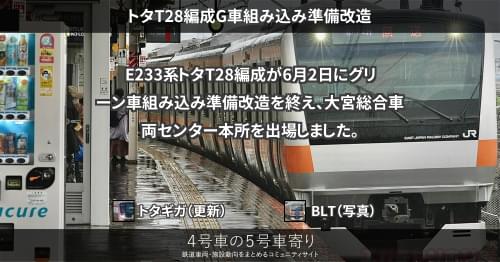 E233系 トタT28編成G車組み込み準備改造 E233系トタT28編成が6月2日にグリーン車組み込み準備改造を終え、大宮総合車両センター本所を出場しました。 https://4gousya.net/forums/post/%e3%83%88%e3%82%bft28%e7%b7%a8%e6%88%90om%e5%87%ba%e5%a0%b4 2023/06/02 2023/06/03 トタギガ E233系