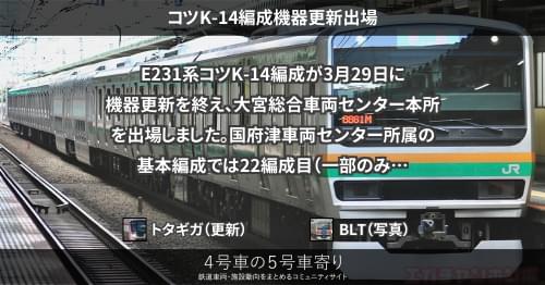 E231系コツK-14編成が3月29日に機器更新を終え、大宮総合車両センター本所を出場しました。