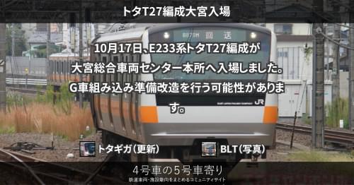 E233系 トタT27編成大宮入場 10月17日、E233系トタT27編成が大宮総合車両センター本所へ入場しました。 G車組み込み準備改造を行う可能性があります。 https://4gousya.net/forums/post/%e3%83%88%e3%82%bft27%e7%b7%a8%e6%88%90om%e5%85%a5%e5%a0%b4 2022/10/17 トタギガ E233系
