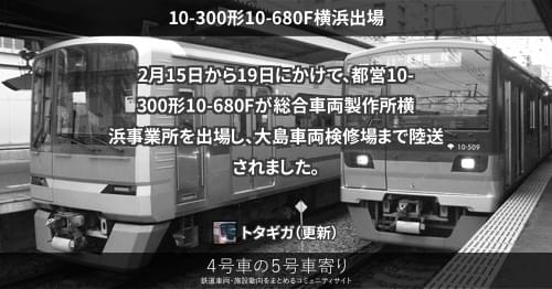 都営 10-300形10-680F横浜出場 2月15日から19日にかけて、都営10-300形10-680Fが総合車両製作所横浜事業所を出場し、大島車両検修場まで陸送されました。 https://4gousya.net/forums/post/%e9%83%bd%e5%96%b610-300%e5%bd%a210-680f-j-trec%e6%a8%aa%e6%b5%9c%e5%87%ba%e5%a0%b4 2022/02/19 2022/02/20 トタギガ 都営